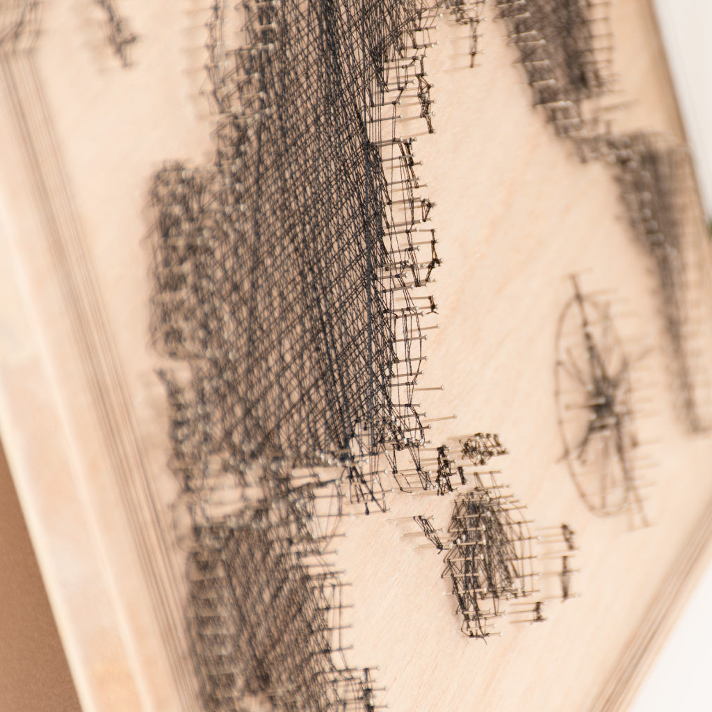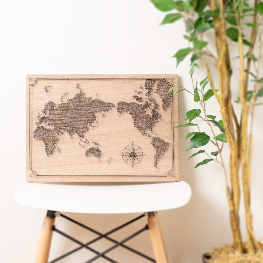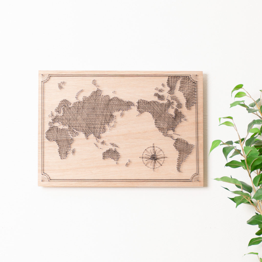細い釘と糸を使った世界地図のデザインです。
