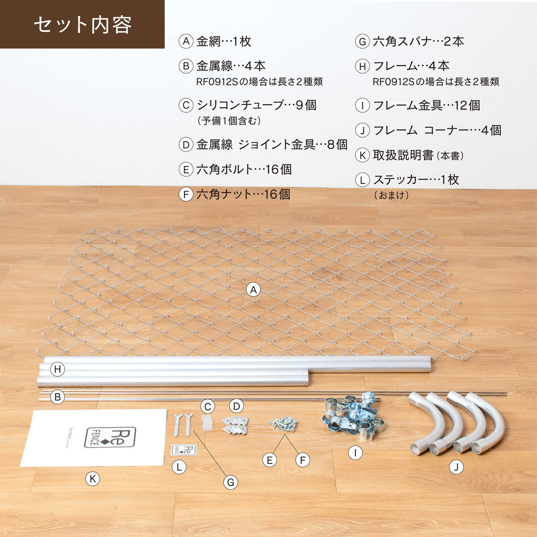 ・金網、金属線、フレーム金具、六角ボルト、六角ナット、六角スパナ:スチール |